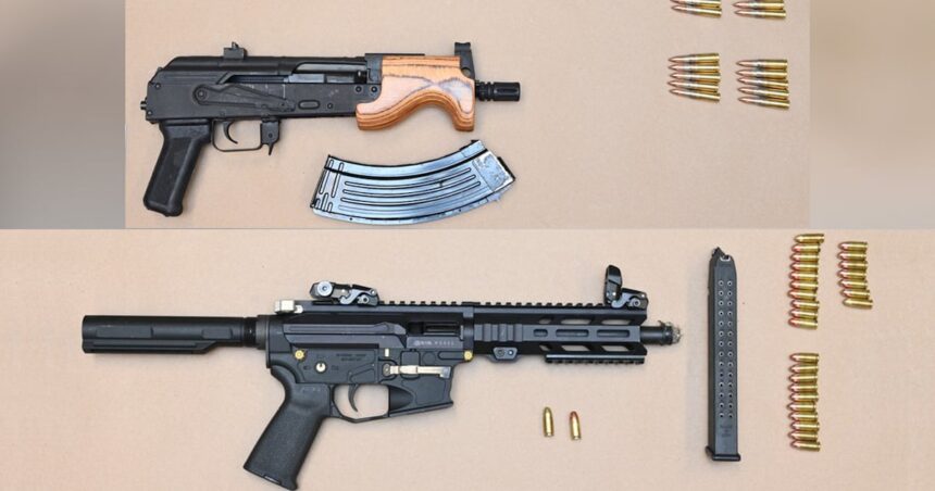 During the search, police recovered five loaded firearms including what they described as a “loaded AK-47 style rifle with a high-capacity magazine,” two AR-style rifles, and two handguns. Officers also seized more than 200 rounds of ammunition and various prohibited devices.